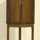A George III oak bowfront hanging corner cabinet with crossbanded decoration, the moulded pediment above a pair of doors enclosing shelves and two drawers, raised on a later oak base.