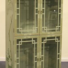 A pair of late 20th Century chinoiserie display cabinets, decorated with birds and flowering blossoms against a duck egg blue ground, enclosed by four glazed trellis panel doors, on cabriole legs and pad feet, heights approx 190cm, widths approx 89cm.