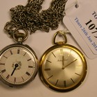 A Mathey-Tissot gold cased keyless wind open-faced lady's dress watch, with a signed gilt jewelled Swiss lever movement, the signed silvered dial with gilt baton numerals and gilt hands, together with a silver cased keyless wind open-faced lady's fob watch with a decorated enamel dial, the case with engraved decoration, detailed '0, 935', with a silver multiple link neckchain on a boltring clasp.