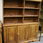 An 18th Century and later stripped pine dresser, the moulded pediment above four shelves, the lower section fitted with three panelled doors, raised on bracket feet, height approx 173cm, width approx 143cm (alterations).