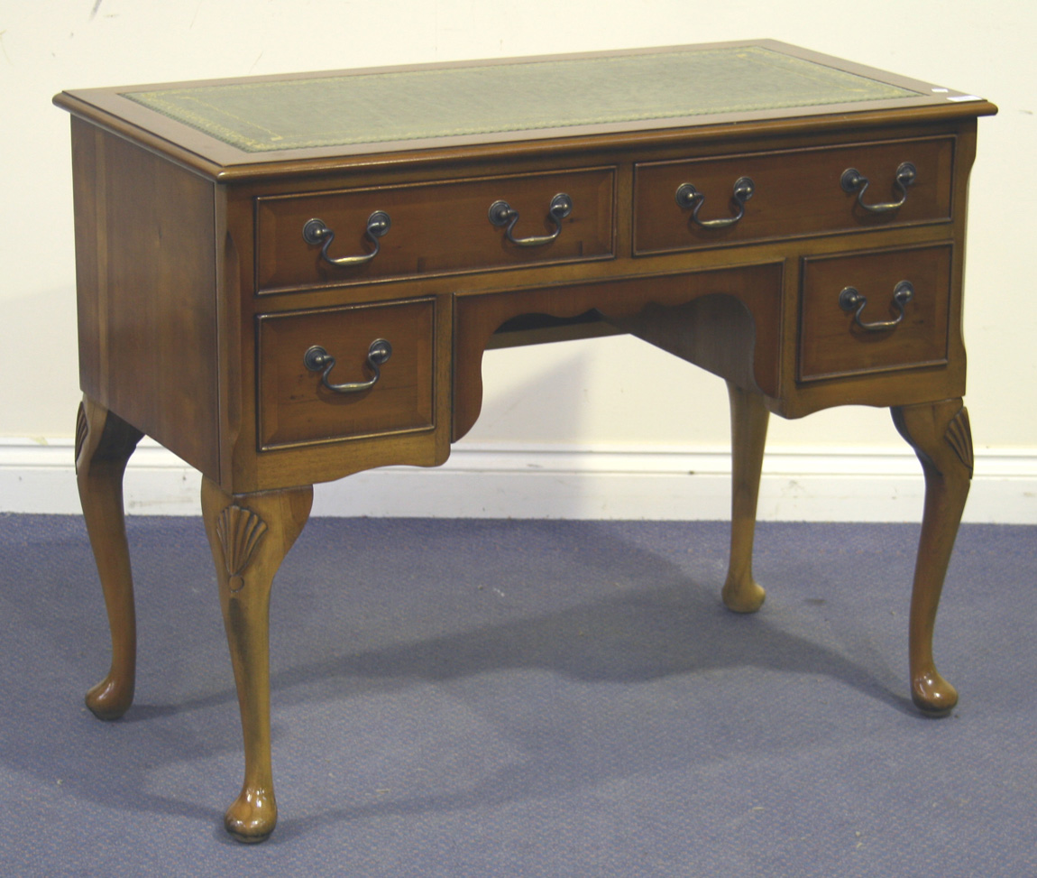 A 20th Century yew kneehole writing table, the moulded top inset with green leather above four drawers, on cabriole legs, width approx 99cm.