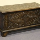 A Victorian oak coffer, the hinged lid and front with carved foliate decoration, on bracket feet, width approx 106cm.