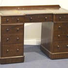 A Victorian mahogany inverted breakfront twin pedestal desk, the inset leather writing surface above an arrangement of nine drawers, raised on plinth bases, width approx 121cm, depth approx 58cm.