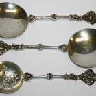 A pair of silver serving spoons and matching sifter spoon, each circular bowl with mask and scroll cast handle, London 1899 and 1901 by William Hutton & Sons.