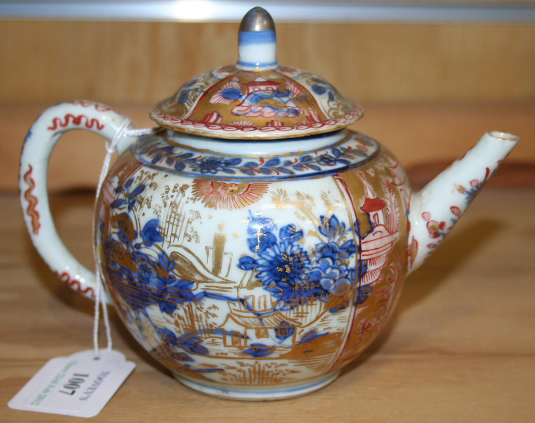A Chinese 'clobbered' export porcelain teapot and cover, Qianlong period, the globular body decorated with underglaze blue flowers and embellished in iron red and gilt with pavilions and landscapes, height approx 12.5cm (minor faults).