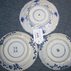 A Chinese blue and white export porcelain saucer, Kangxi period, painted with a central display of flowers and perforated rockwork within a floral panelled rim, artemisia leaf mark to base, together with two similar saucers (faults).