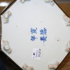 A Chinese brass mounted blue and white porcelain kettle and cover, late 19th Century, of octagonal form, painted with a continuous figural scene, beneath a brass overhead handle, pseudo four character mark of Xuande in underglaze blue to base, height approx 18cm.