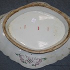 A Chinese famille rose blue ground porcelain dish, late 19th/early 20th Century, the lozenge shaped bowl painted with flowers on a blue ground within a yellow ground key fret rim, length approx 41cm.