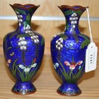 A pair of Japanese cloisonné vases, Meiji period, each baluster body and flattened neck decorated with wisteria above iris on a blue ginbari ground, height approx 15.5cm.