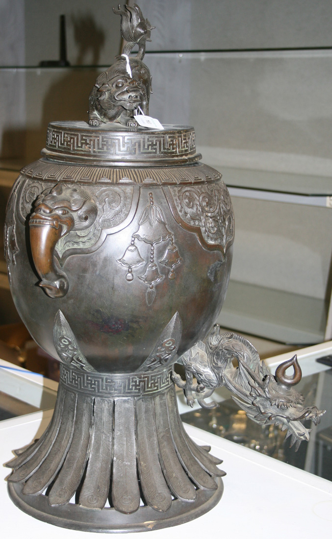 A Japanese brown patinated bronze samovar, Meiji period, the cover with key fret border and shishi finial, the ovoid body cast with foliate pendants and floral filled ruyi head collar, flanked by a pair of Buddhistic lion head and tongue handles, above a dragons head spout, on a peacock feather spreading base, height approx 65cm.