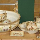 Twenty-four pieces of Crown Devon Fieldings 'Etna' pattern wares, decorated with hanging pots of pink roses against a blush ivory ground, including two pairs of vases, a wash bowl, five plates, dressing table items and a teapot and cover (faults).