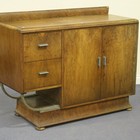 An Art Deco walnut dining room suite with chrome mounts, comprising a draw-leaf table, a set of four chairs and a sideboard.