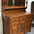 An Edwardian oak sideboard, the mirrored back with reeded supports above an arrangement of five drawers and three panelled cupboards, on bun feet, width approx 140cm.