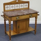 A Victorian satin walnut washstand, the arched back inset with brown printed earthenware tiles depicting classical figures, above a rouge marble top, the single frieze drawer flanked by towel rails above a central cupboard and undertier, on turned tapering legs.