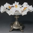 A German silver and opaline glass tazza, the shallow bowl with wavy rim painted with birds, butterfly and flowers, on a knop stem and flared base terminating in scroll feet embossed with ribbons and foliate garlands.