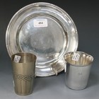 An Alpacca plated circular dish with ribbon and reeded rim, together with a plated beaker embossed with a continuous band of vertical daisies, and a Christofle plated beaker.