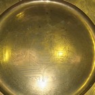 A large Chinese brass circular dish, probably early/mid-20th Century, the centre engraved with a scene of a seated gentleman looking out through a window at two maidens standing on a terrace, the broad rim engraved with a panel of lotus and five figural panels within a floral border, diameter approx 84cm.