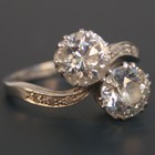 A platinum and diamond ring, claw set with the two principal cushion shaped diamonds between diamond set three stone shoulders in a crossover design, the mount detailed 'Plat'.