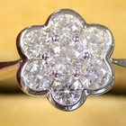 A white gold and diamond set seven stone cluster ring, mounted with a circular cut diamond within a surround of six smaller circular cut diamonds.