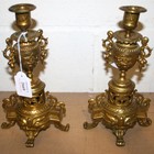 A pair of late 19th/early 20th Century brass candlesticks, each urn shaped sconce and stem cast with scrolls, on four scroll feet.