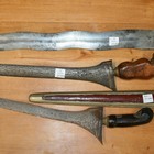 A large kris with wavy double-edged blade, length approx 56cm, cord-bound wooden grip, a kris with straight watered blade, length approx 36cm, carved hardwood grip, and another kris with straight watered blade, carved dark hardwood grip, in its part nickel-covered wooden sheath.