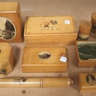 A collection of Mauchline ware boxes, including a cylindrical container, transfer printed with a titled scene of Lympne Castle, and a box painted with a boxer dog.