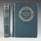 "AMUNDSEN, Roald. 'The North West Passage', being the Record of a Voyage of Exploration of the Ship ""Gjöa"" 1903-1907. London: Archibald Constable and Company Limited, 1908. First English Edition, 2 vols., 8vo (233 x 160mm.) Frontispieces, numerous illustrations, 2 folding maps in pockets at rear. (Occasional spotting, mostly to fore-edge.) Original cloth, t.e.g. (slightly soiled, extremities bumped). Provenance: George Blaxland (inscriptions to front-free endpapers with address 'Gillingham House, Kent'.)"