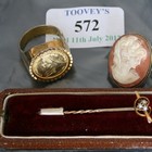 A gold topped and seed pearl set stick pin detailed '15c', cased, an oval shell cameo pendant brooch designed as the portrait of a lady, and a gilt metal and imitation coin dress ring.