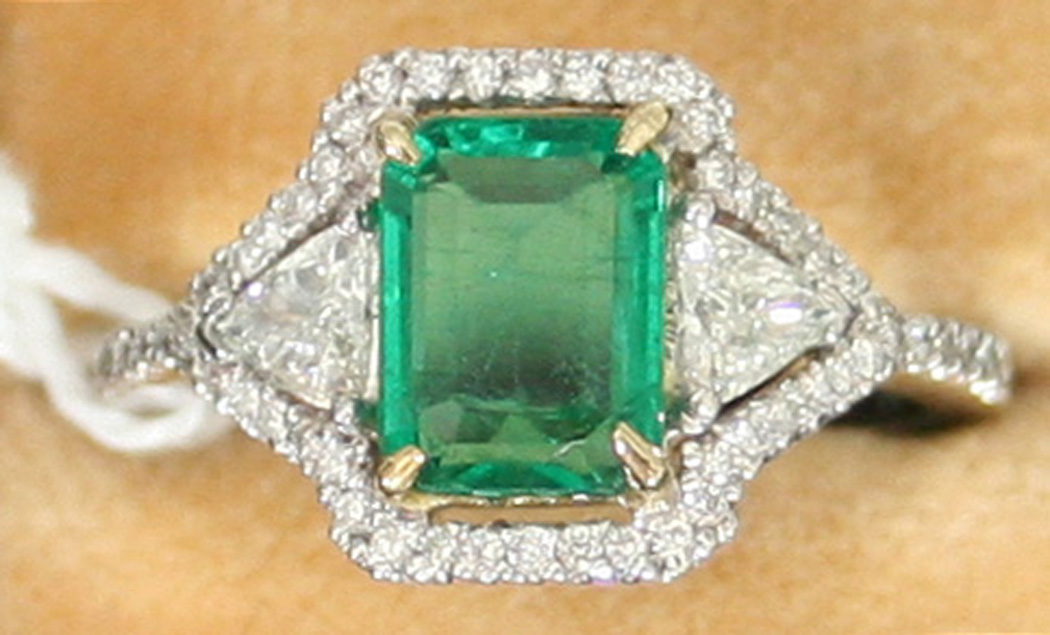 An 18ct white gold, emerald and diamond set ring, mounted with the cut cornered rectangular step cut emerald between triangular cut diamond set shoulders, within a border of small circular cut diamonds.