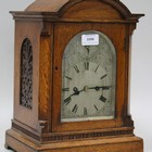An Edwardian oak mantel clock with eight day movement striking on a gong, the silvered dial with slow/fast indicator above Roman numerals, bordered by engraved scrolling foliage, the case with moulded arch pediment above cut corners and pierced fret panels to sides, on a plinth base and bracket feet, height approx 33.5cm, together with a pendulum.