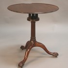 A George III and later mahogany wine table with a moulded top and a birdcage mount, supported by a stop fluted column, the tripod cabriole legs carved with acanthus leaf sprays and terminating in claw and ball feet and castors, diameter approx 64cm (alterations).
