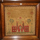 An early Victorian needlework sampler by Hannah Bannister, aged 13, 1841, with a panel of pious verse above a school or stately home, trees and animals, all contained within a strawberry border, worked with coloured threads in short stitches, approx 60.5cm x 63cm, within a rosewood and bird's eye maple frame of wide section.