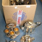 A 19th Century Sheffield plate egg cruet with foliate scroll decoration, on scroll feet, a set of four plated shell shaped salts and spoons, cased, a pair of glass specimen vases with silver collars, a pair of Sheffield plate chambersticks, and a collection of other plated and silver items.