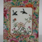 A Chinese famille rose porcelain brush pot, modern, of square section, each side painted with birds flying above flowers, reserved against a mille fleurs ground, iron red seal mark to base, height approx 13.2cm.