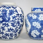 A Chinese blue and white porcelain ginger jar, mark of Kangxi but late 19th Century, painted with a dense lotus and tendril design, pseudo underglaze blue six character mark to base, height approx 23cm, together with a Chinese blue and white ginger jar and cover, late 19th Century, painted with precious vessels and objects against a prunus ground, height approx 21cm (cover repaired).