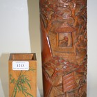 A Chinese bamboo brush pot, 20th Century, of square section, the sides incised and stained with opposing green lines of text flanked by a landscape panel and bamboo, together with a carved bamboo brush pot and a carved alabaster sage (faults).