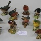 Eleven small Beswick birds, comprising blue tit, wren, whitethroat, robin, stonechat, nuthatch, chaffinch, bullfinch, goldfinch, goldcrest and greenfinch (fault to last).