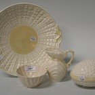 A Belleek Limpet pattern cake plate, 1965-1981, together with three pieces of Belleek, 1965-1981, comprising a cream jug, a sugar bowl and an ornamental egg.