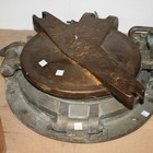 Three cast brass circular portholes, a porthole frame and associated porthole covers.