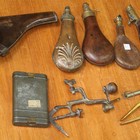 A leather covered powder flask by Hawksley, an embossed copper powder flask by Hawksley (charger springs broken), two leather shot flasks, a brass bullet mould to cast a hollow based 28 bore bullet (sprue cutter missing), a German Mauser cleaning kit, a military leather revolver holster, etc.