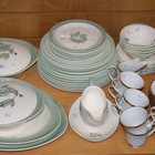 A Wedgwood 'Woodbury' pattern part service, comprising a graduated pair of oval platters, two tureens and covers, a sauceboat and stand, seven dinner, dessert and side plates and four soup bowls with six stands (minor faults), together with a Noritake 'Elysee' pattern six piece coffee set.