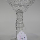 A facet cut sweetmeat glass, late 18th Century, the ogee bowl cut with diamonds and triangles beneath the pointed and scalloped rim, raised on a centrally knopped diamond faceted stem and scalloped edge domed foot, cut with oval facets, height approx 17.5cm.