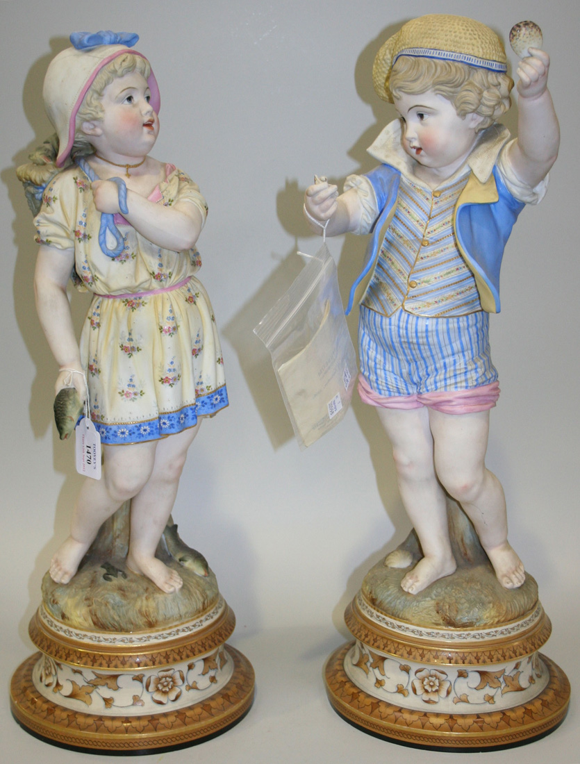 A large pair of bisque porcelain figures of children, late 19th Century, modelled as a girl carrying a basket of fish and a boy holding shells, each raised on a circular base decorated with foliate banded detail in shades of brown, black printed factory mark to bases, height approx 61cm (minor fault to boy).