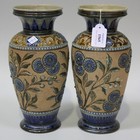 A pair of Doulton Lambeth stoneware vases, late 19th Century, decorated by Louisa E. Edwards and Harriett E. Hibbut, with branches of mimosa and blue flowerheads against a buff textured ground, impressed and incised factory marks to bases, height approx 29cm (some restoration to one).