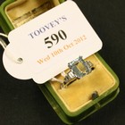 An aquamarine and diamond ring, claw set with the cut cornered rectangular step cut aquamarine between baguette diamond set tapering three stone shoulders.