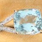 An 18ct gold, aquamarine and diamond ring, claw set with the cushion shaped aquamarine between diamond set 'V' shaped shoulders.