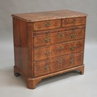 A George II walnut bachelor's chest, the moulded top with a crossbanded and chequer inlaid border, the canted and fluted corners flanking two short drawers above a brushing slide and three graduated long drawers, on shaped bracket feet, height approx 82cm, width approx 87cm (alterations and restoration).