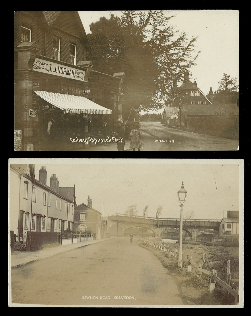 An album containing 64 postcards, all British topographical views, including photographic postcards titled 'Railway Approach Fleet', 'Station Road, Kelvedon', 'Children's Corner, Bournemouth', 'Ipswich, Entrance to Cattle Market', 'Canvey Island from Benfleet, showing New Bridge', 'Balloon School Headquarters, Larkhill Camp, nr Salisbury', 'Alcester June 22/11', 'The Prison, Princetown' and a few of shopfronts.