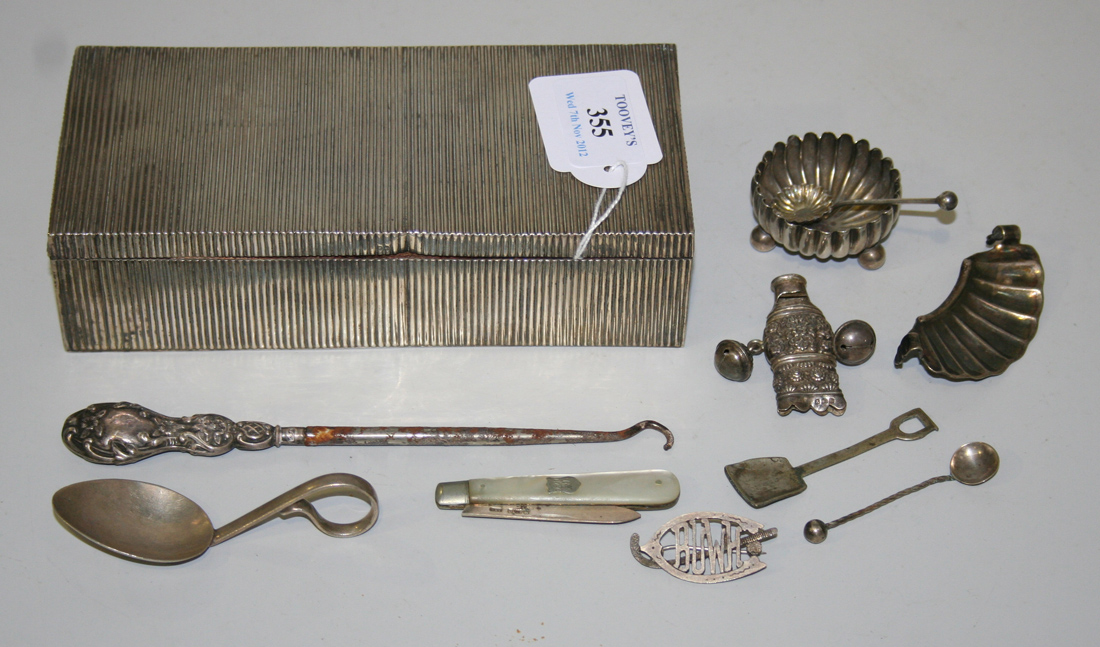 A late Victorian silver cigarette box with ribbed decoration, Birmingham 1888, and a small collection of other silver and plated items.