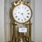 An early 20th Century German brass anniversary timepiece, the white dial with Roman numerals, on a circular base with glass dome.